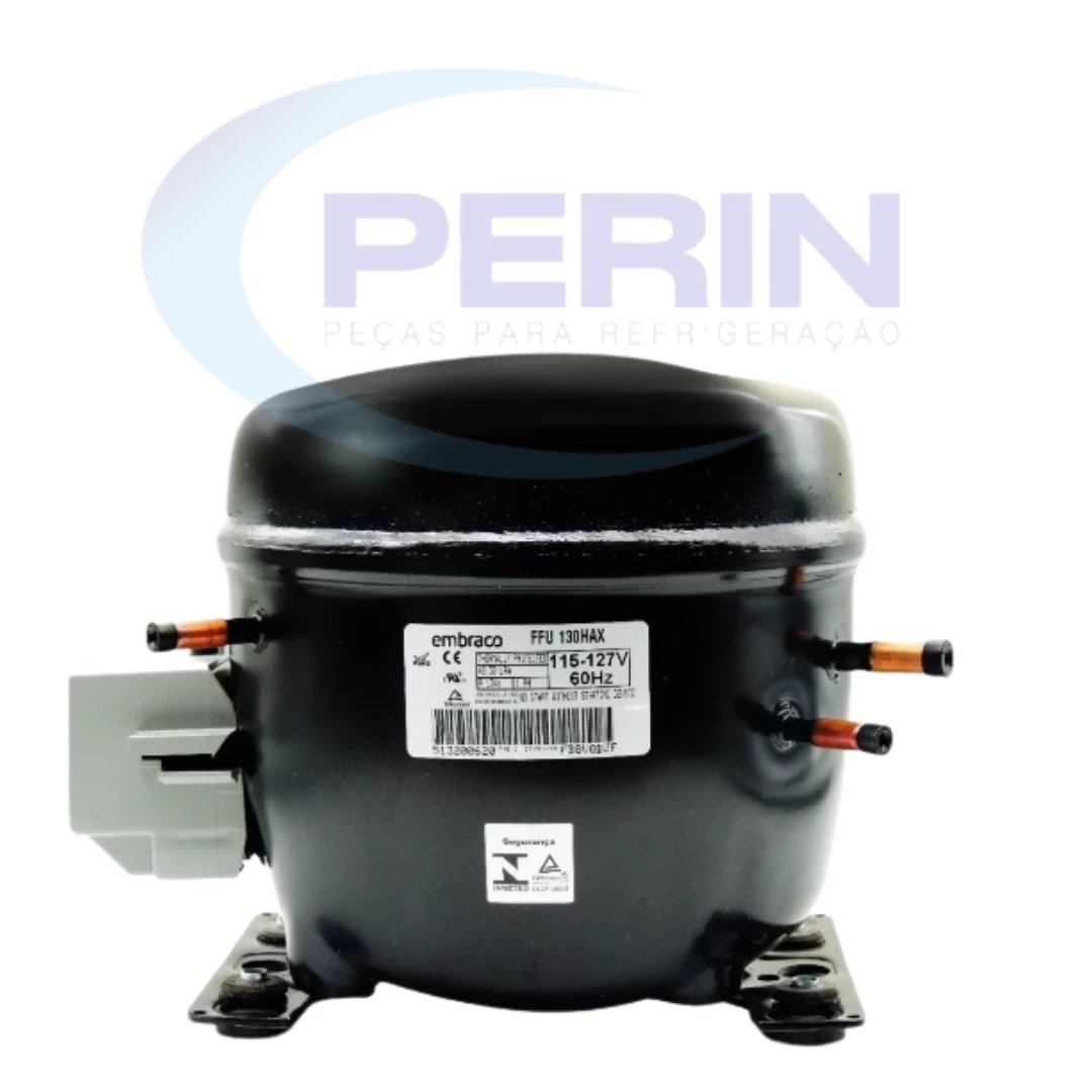 Compressor Embraco modelo FFUS130HAX, gás refrigerante R134a, potência 1/3+ HP e tensão 127V. Projetado para aplicações de refrigeração comercial e doméstica, oferecendo alta confiabilidade, baixo consumo de energia e operação silenciosa. Compatível com diversos modelos de refrigeradores, expositores e balcões refrigerados.