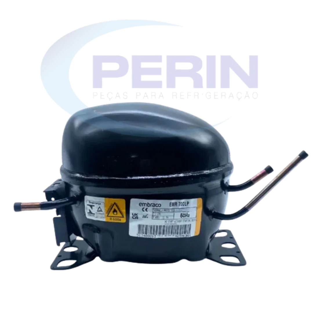 Compressor Embraco modelo EMR70CLP, gás refrigerante R600a, potência 1/5 HP e tensão 220V. Indicado para aplicações em refrigeradores domésticos e comerciais leves, garantindo alta eficiência energética, baixo nível de ruído e longa durabilidade. Compatível com diversos modelos que utilizam R600a.