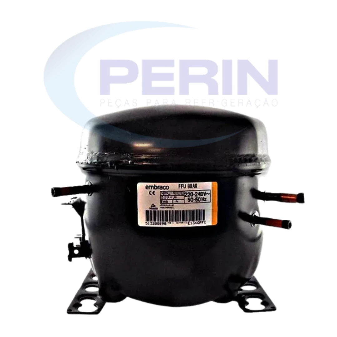 Compressor Embraco modelo FFU80AK, gás refrigerante R12, potência 1/4+ HP e tensão 220V. Indicado para sistemas de refrigeração antigos e equipamentos que utilizam R12, garantindo desempenho confiável e operação silenciosa. Compatível com diversos modelos de refrigeradores e freezers.