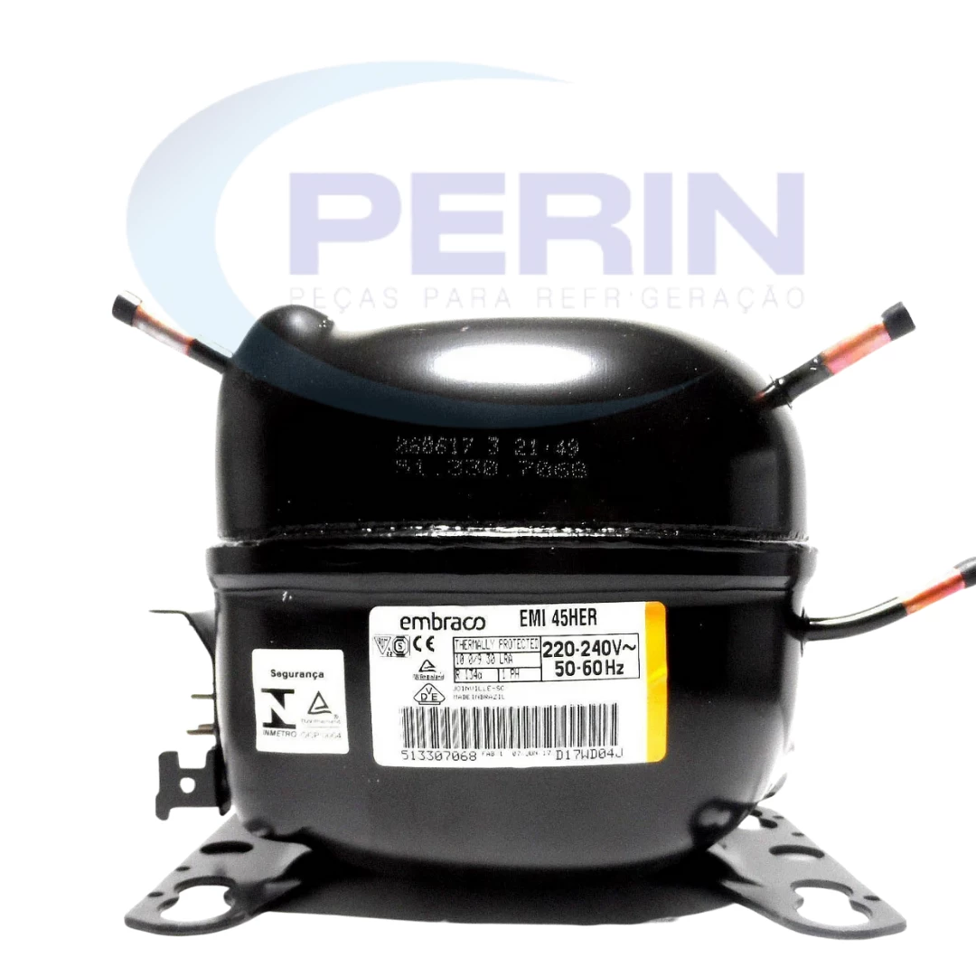 Compressor Embraco modelo EMI45HER, gás refrigerante R134a, potência 1/8 HP e tensão 220V. Indicado para sistemas de refrigeração compactos, como frigobares e pequenos expositores, oferecendo operação silenciosa, alta eficiência energética e confiabilidade.