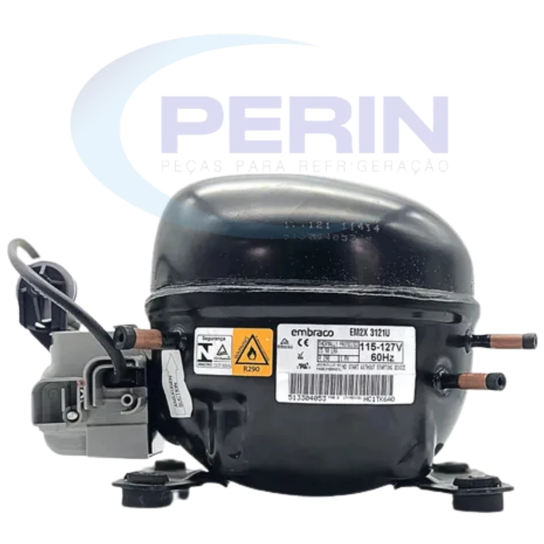 Compressor Embraco modelo EM2X3121U, gás refrigerante R290, potência 1/3 HP e tensão 220V. Ideal para aplicações comerciais que exigem alta eficiência energética, operação silenciosa e durabilidade. Compatível com diversos equipamentos que utilizam R290, garantindo encaixe perfeito e desempenho confiável. Código interno: 51330405998XC.