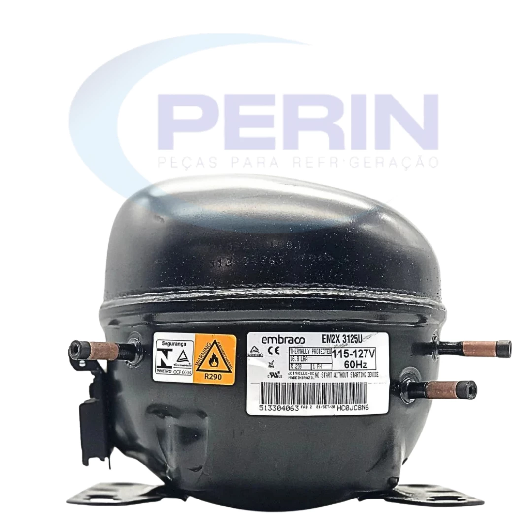Compressor Embraco modelo EM2X3125U, gás refrigerante R290, potência 1/3+ HP e tensão 127V. Projetado para aplicações comerciais de refrigeração que exigem alta eficiência energética e operação silenciosa. Compatível com diversos equipamentos que utilizam R290, garantindo encaixe perfeito e longa durabilidade. Código interno: 51330405296VC.