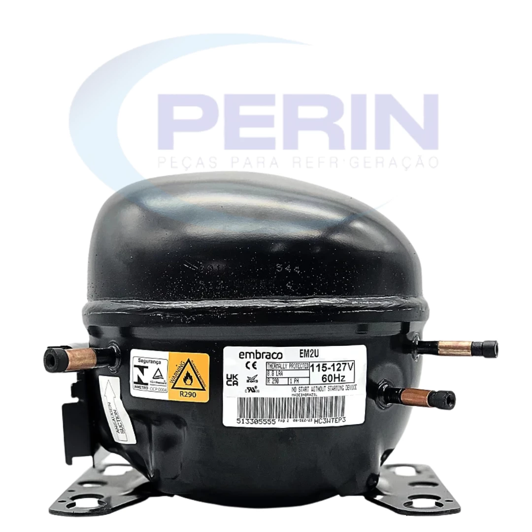 Compressor Embraco modelo EM2U3115U, gás refrigerante R290, potência 1/4 HP e tensão 127V. Desenvolvido para aplicações em refrigeração doméstica e comercial leve, oferece alto desempenho, baixo consumo de energia e operação silenciosa. Compatível com diversos sistemas que utilizam R290. Código interno: 51330553597TC.