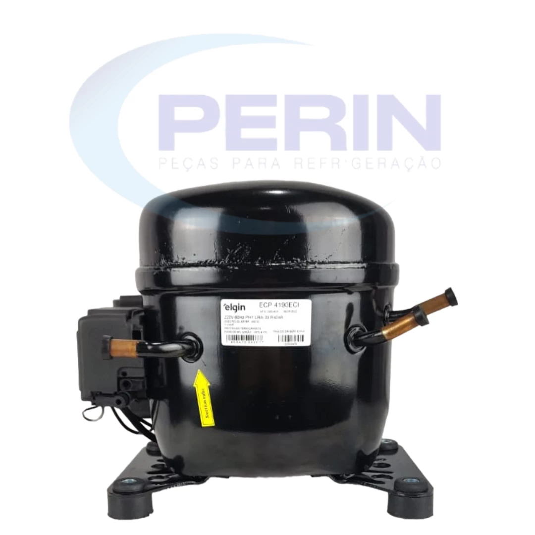 Compressor Elgin modelo 45ECP4190ECI, compatível com gases refrigerantes R22 e R404, potência 1.1/4 HP e tensão 220V. Recomendado para aplicações comerciais e industriais de refrigeração, como câmaras frias e balcões refrigerados. Produto robusto e confiável, projetado para oferecer alto desempenho, eficiência energética e durabilidade. Observação: Limpeza do equipamento é obrigatória antes da instalação para garantir o correto funcionamento.