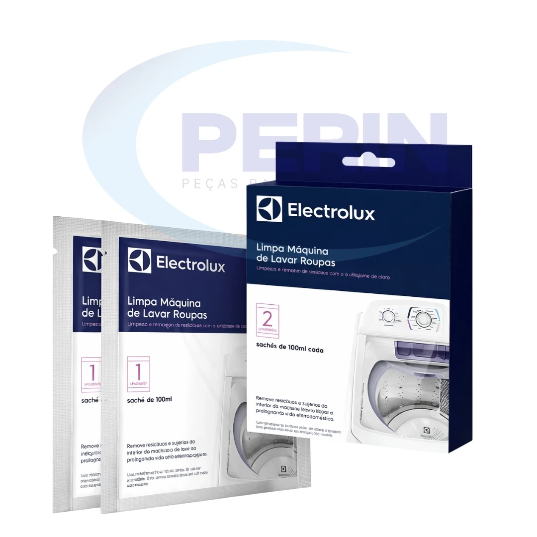 Limpa máquina de lavar roupas, referência 80000723, composto por 2 unidades em saches de 100ml cada, indicado para a higienização interna da lavadora. Auxilia na remoção de resíduos de sabão, amaciante, gordura e odores acumulados no tanque e tubulações, contribuindo para melhor desempenho do equipamento e maior durabilidade dos componentes internos.