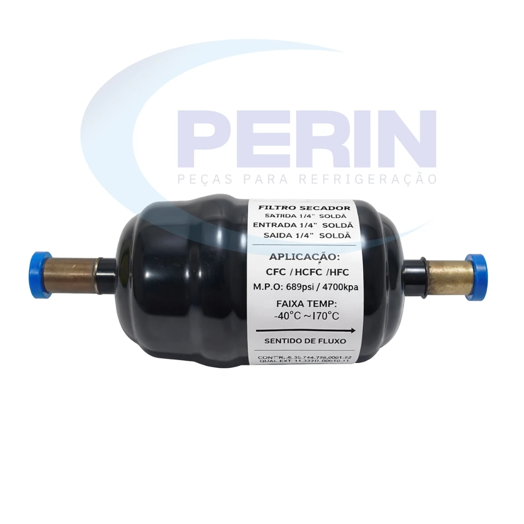 Filtro secador Elgin com conexão 1/4 para solda, referência 45FSE032S140, utilizado em sistemas de refrigeração para retenção de umidade, ácidos e impurezas presentes no circuito. Componente essencial para proteger o compressor e garantir o funcionamento adequado do sistema, prevenindo contaminações que possam causar falhas e redução da vida útil do equipamento.