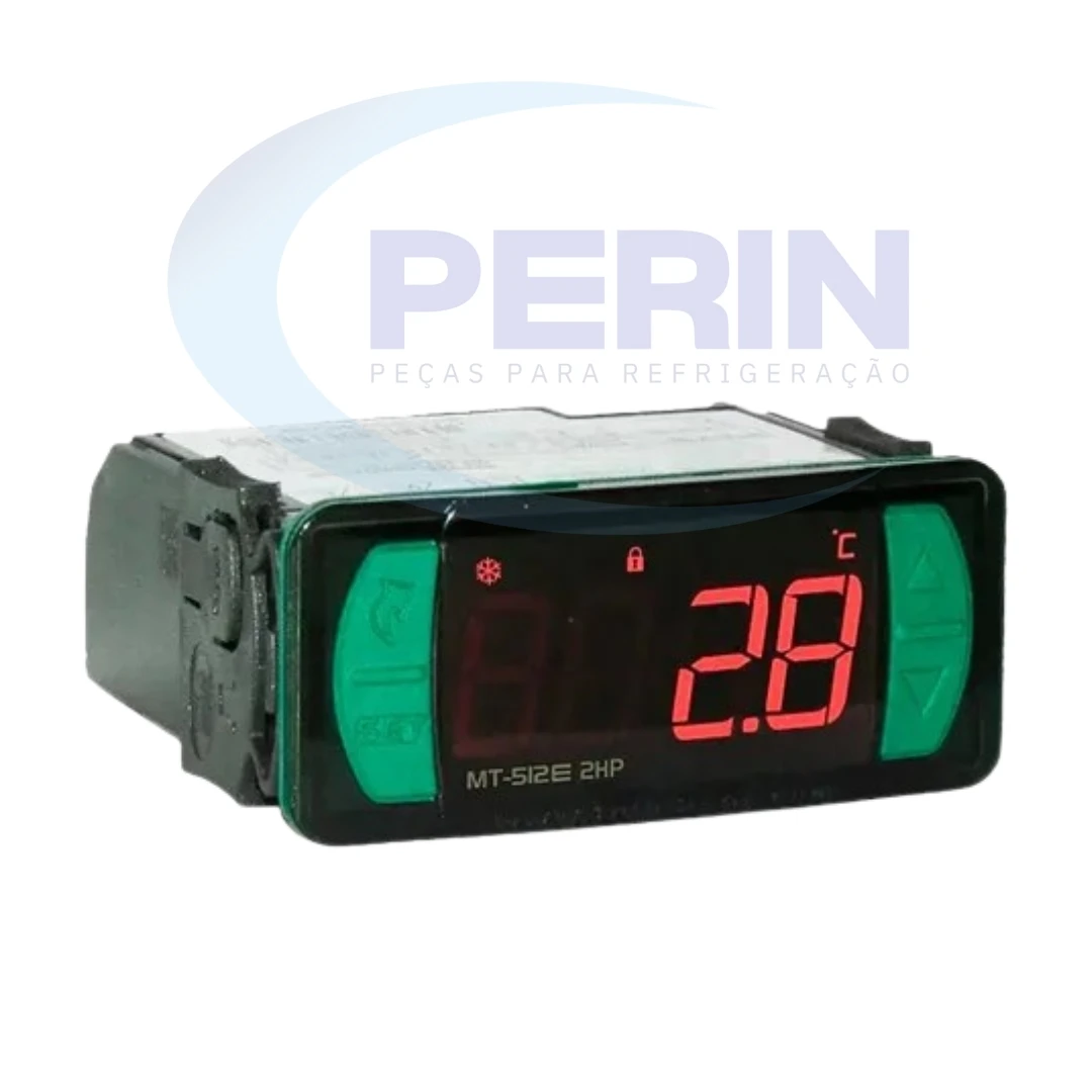 Controlador digital Full Gauge MT512E, capacidade de até 2HP, referência 03614, indicado para controle de temperatura em sistemas de refrigeração comercial. Equipamento microprocessado que realiza o acionamento do compressor conforme a temperatura programada, oferecendo precisão, confiabilidade e fácil configuração. Ideal para balcões refrigerados, câmaras frias e expositores.