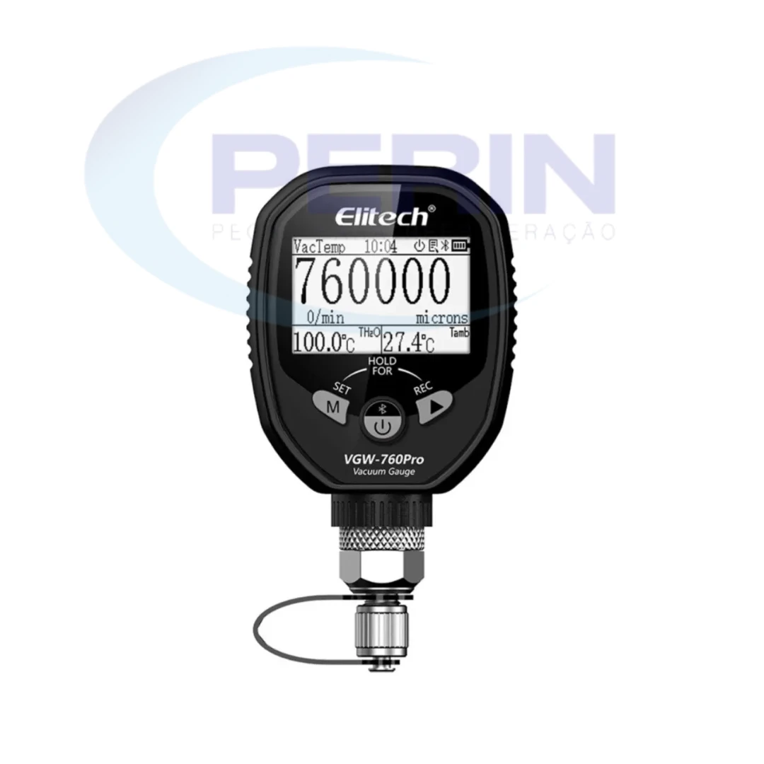 Vacuômetro digital Elitech VGW-760 Pro, referência 4241, com medição de até 760.000 microns, equipado com Bluetooth, indicado para monitoramento preciso de vácuo em sistemas de refrigeração e ar-condicionado. Utilizado durante processos de evacuação do sistema frigorífico, permite acompanhar a remoção de umidade e gases não condensáveis com alta precisão. Possui conectividade com dispositivos móveis para leitura e registro de dados em tempo real, auxiliando no controle técnico durante instalação e manutenção.