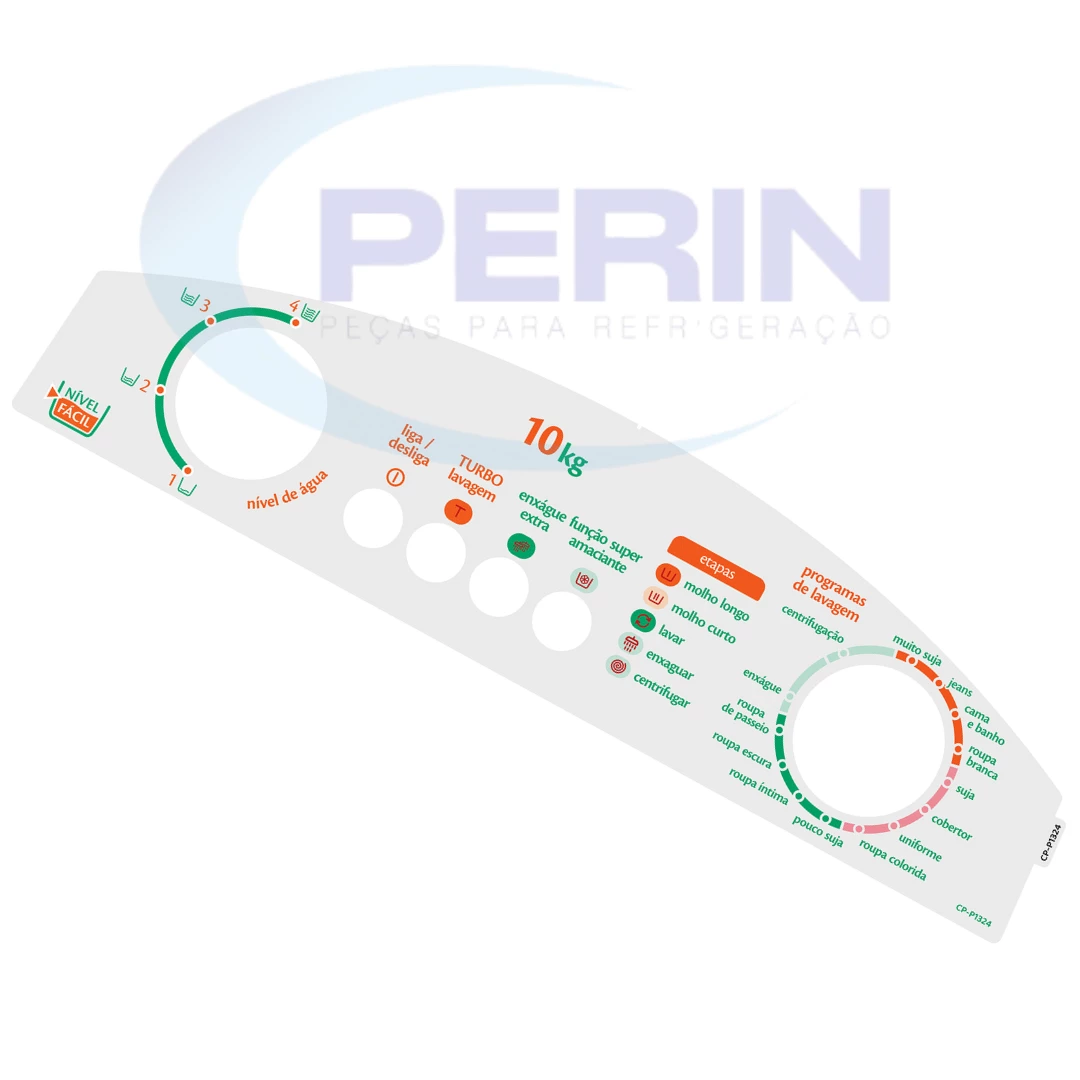 Painel decorativo CP compatível com lavadora Consul 10kg modelo CWL10. Código interno P1324. Indicado para reposição estética da parte frontal da lavadora, com encaixe preciso, acabamento resistente e excelente durabilidade. Código original da peça não localizado. Ideal para manutenção visual e conservação do padrão da linha Consul.
