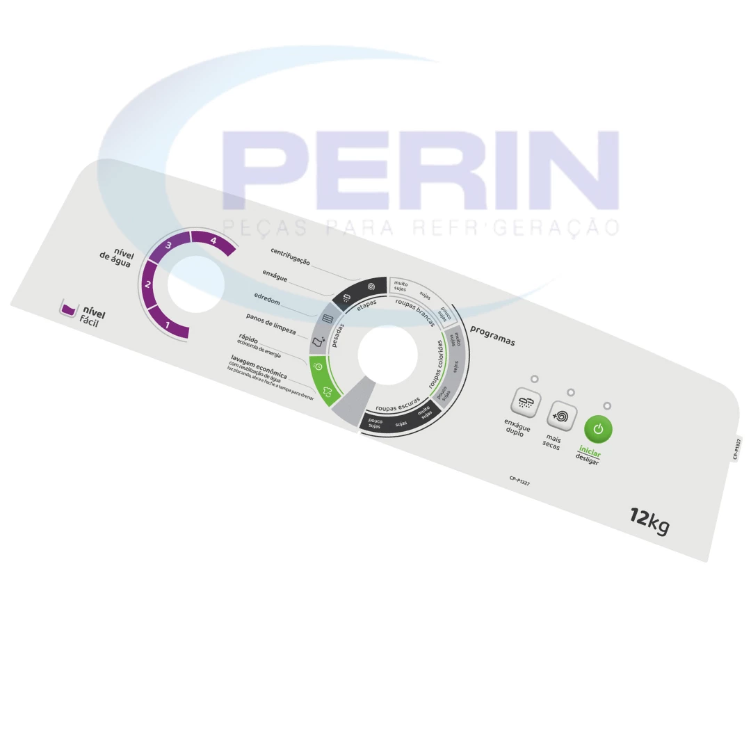 Painel decorativo CP compatível com lavadora Consul 12kg modelo CWH12AB. Código interno P1327. Indicado para reposição estética da parte frontal da lavadora, com encaixe perfeito e acabamento durável. Código original da peça não localizado. Ideal para manutenção visual do aparelho, preservando o padrão de qualidade da linha Consul.